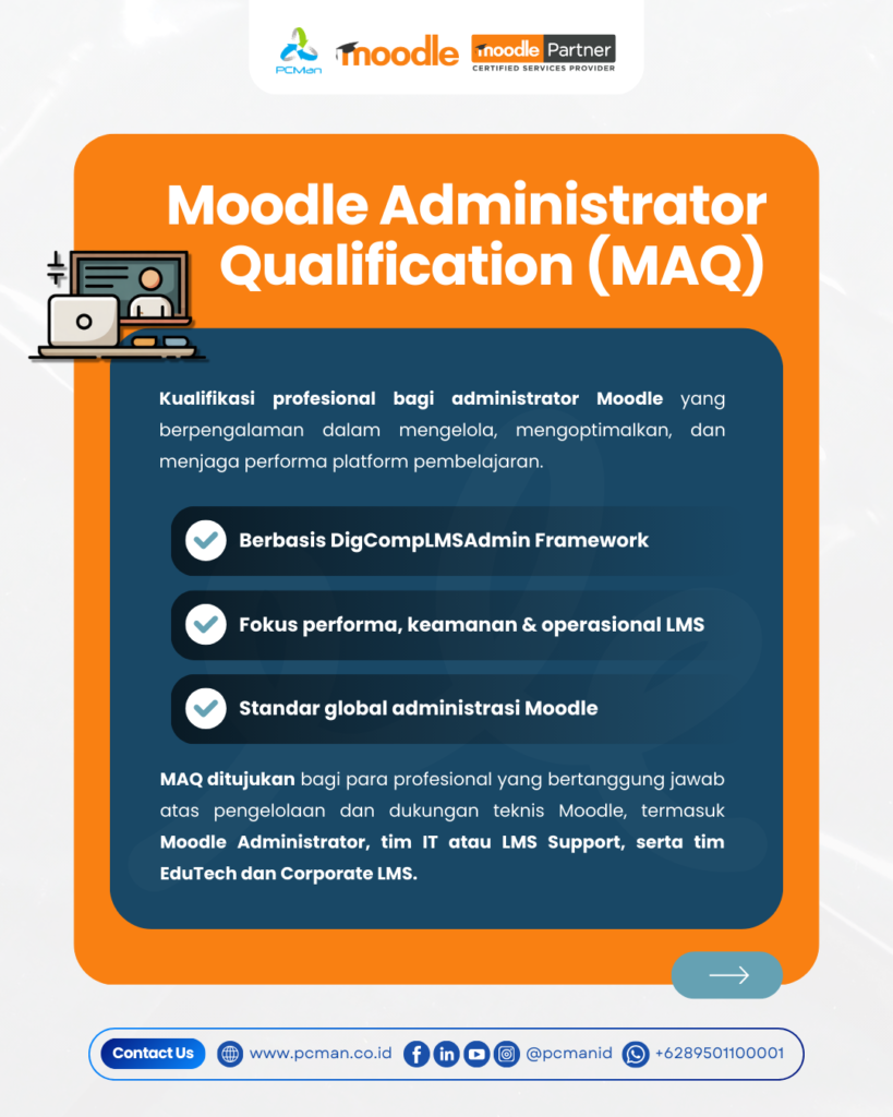 Untuk memastikan kemampuan ini diakui secara internasional, Moodle menghadirkan Moodle Administrator Qualification (MAQ) — sertifikasi resmi yang menilai keahlian teknis dan manajerial dalam mengelola platform Moodle.